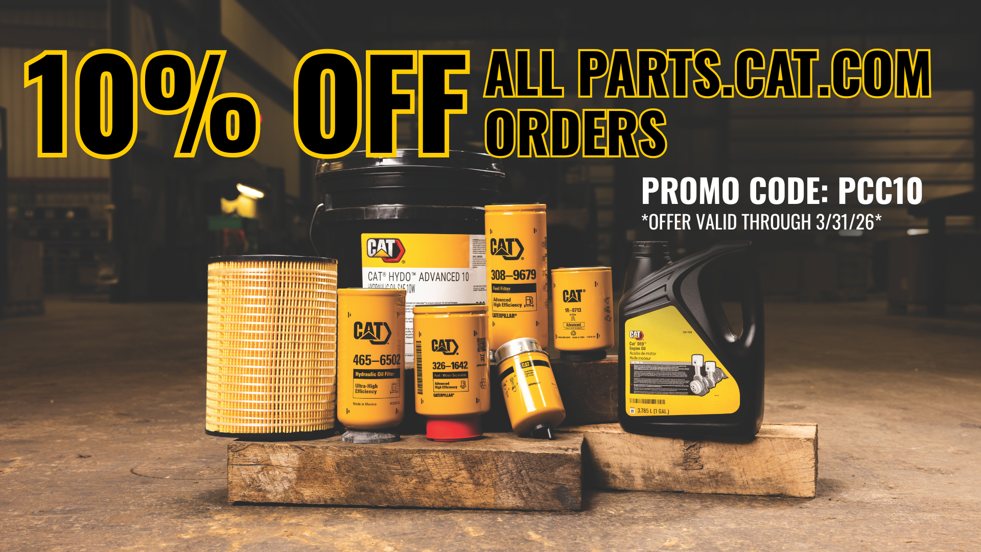 Only available online on PARTS.CAT.COM and the Cat® Central App. Users must be logged into their account to use the promotion code. Promotion available now through March 31st, 2026.