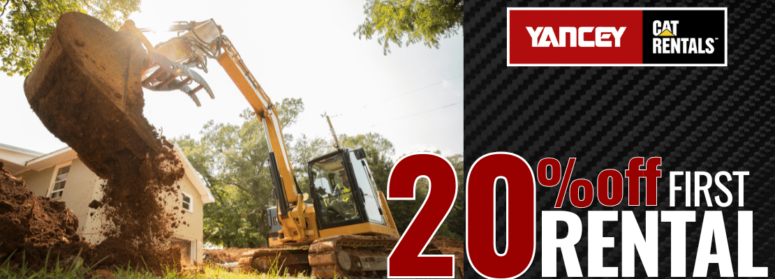 Yancey Rents makes it easy for new customers across Georgia to get the equipment they need—fast and for less. If you’re renting with Yancey Rents for the first time, you can save 20% off your first equipment rental, helping you control costs without sacrificing uptime, reliability, or service.